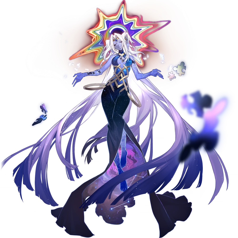 Xipe presents as a serene periwinkle-skinned humanoid with three faces — two on either side of the head and one on the front. The faces are framed with lengthy white curtain bangs and are each adorned with a circlet. Xipes' extensive swathe of hair is colored white with a twinkling dark purple ombre. A bright amalgamation of colors flares behind THEIR head, reminiscent of a halo.THEIR body, which seems to be made of scattering puzzle pieces, is covered by a form-fitting raiment that is decorated with blue and purple expressions of the cosmos. The outfit's skirt flows long past THEIR feet, and THEIR neck and torso are wrapped firmly in a lattice of gold decorations.